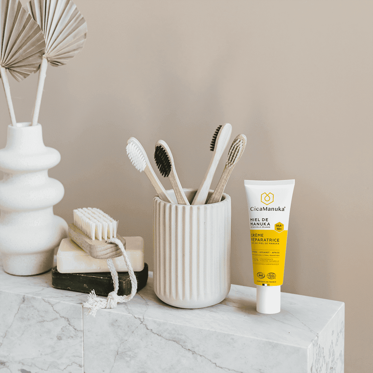 CicaManuka répare et apaise les peaux fragilisées grâce au miel de Manuka IAA®. Textures confort, actifs purifiants et approche dermo‑cosmétique soutiennent la barrière cutanée, favorisant une peau douce, protégée et visiblement plus saine au quotidien.