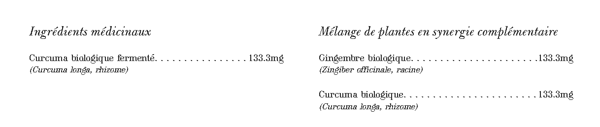 Le CURCUMA est bien plus que juste de la curcumine. Sous sa forme entière, le curcuma procure plusieurs nutriments que notre organisme peut employer afin de nourrir et d’équilibrer ses propres cellules s’il y a inflammation ou oxydation. Lorsque nous fermentons pendant un mois notre curcuma biologique, nous employons nos diverses souches de micro-organismes issus d’une culture de kéfir-kombucha, les nutriments synergiques se transforment alors en des composés encore plus puissants