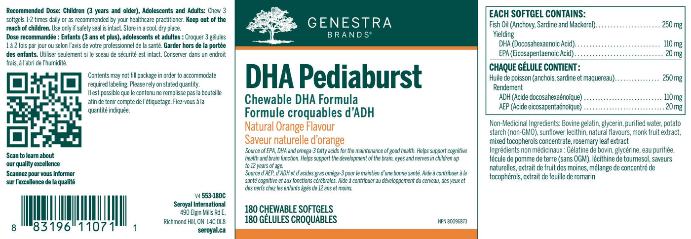 DHA Pediaburst a été spécifiquement conçu pour soutenir la santé cognitive chez les enfants avec une concentration plus élevée de DHA que d'AEP. En tant qu'acide gras oméga-3 le plus abondant dans le cerveau, le DHA aide à soutenir la fluidité membranaire, les signaux neuronaux et la santé des neurones, et peut apporter des avantages cognitifs supplémentaires en augmentant le flux sanguin cérébral. Il est essentiel au bon fonctionnement du cerveau et au développement rétinien pendant le dernier trimestre de la grossesse et la petite enfance, et a démontré des avantages pour la santé cognitive chez les enfants, y compris une amélioration de la capacité de lecture chez les enfants sous-performants. Il a également été démontré que la supplémentation en DHA augmente les taux de DHA érythrocytaire, ce qui est associé à une amélioration de l'alphabétisme et des résultats comportementaux chez les enfants. DHA Pediaburst contient une huile de poisson exceptionnellement pure de forme triglycéride, qui a démontré une plus grande biodisponibilité que les esters éthyliques en recherche clinique. Idéale pour ceux qui n'aiment pas avaler des gélules, cette formule facile à mâcher et savoureuse fournit le DHA dont les enfants ont besoin pour un développement cérébral sain.