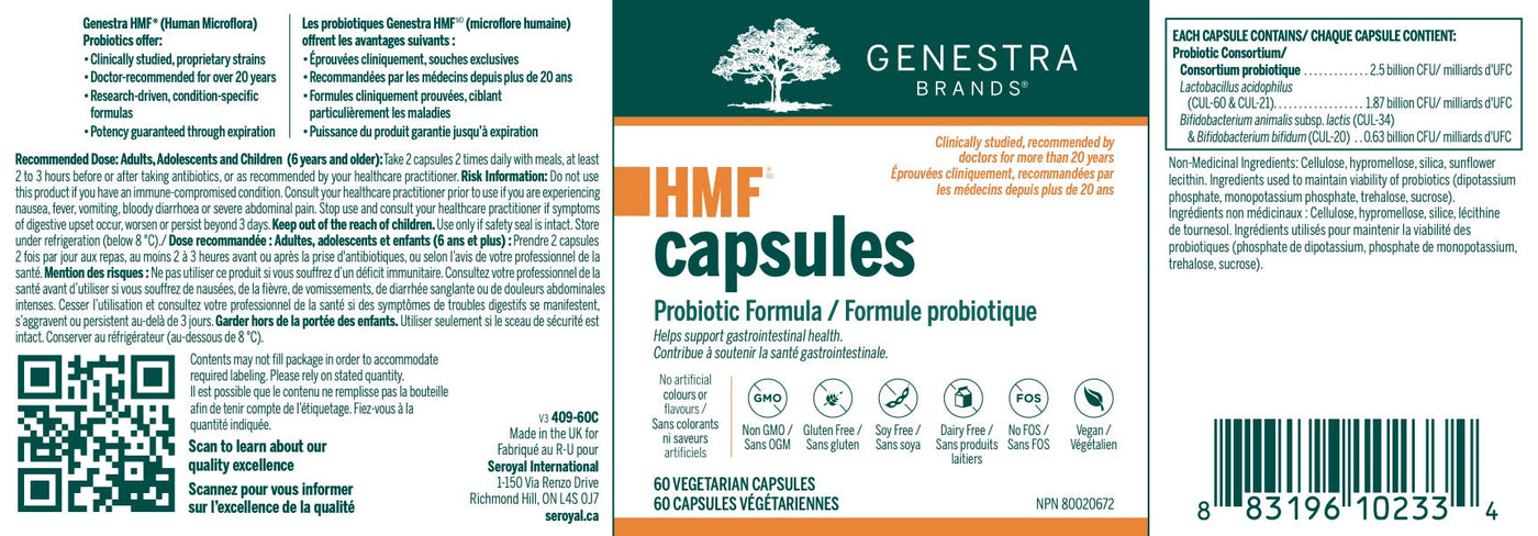 Les capsules HMF® fournissent quatre souches de probiotiques brevetés qui modifient temporairement la flore intestinale chez les adultes et les enfants. La composition de la microflore intestinale est relativement stable, bien qu'elle puisse être modifiée par l'alimentation, le stress, l'âge et les médicaments. Les probiotiques favorisent la présence de bactéries bénéfiques au maintien d'intestins sains. En plus de diminuer la survie des agents pathogènes en augmentant la libération de peptides antimicrobiens par les cellules hôtes, les probiotiques renforcent également la barrière épithéliale. Ils soutiennent l'intégrité des jonctions serrées, qui contrôlent la perméabilité, et augmentent la libération des mucines, qui empêchent les agents pathogènes d'adhérer aux cellules de la surface intestinale. Les capsules HMF® contiennent des souches de lactobacilles et de bifidobactéries issues de la recherche pour favoriser la colonisation de l'intestin grêle et du gros intestin.