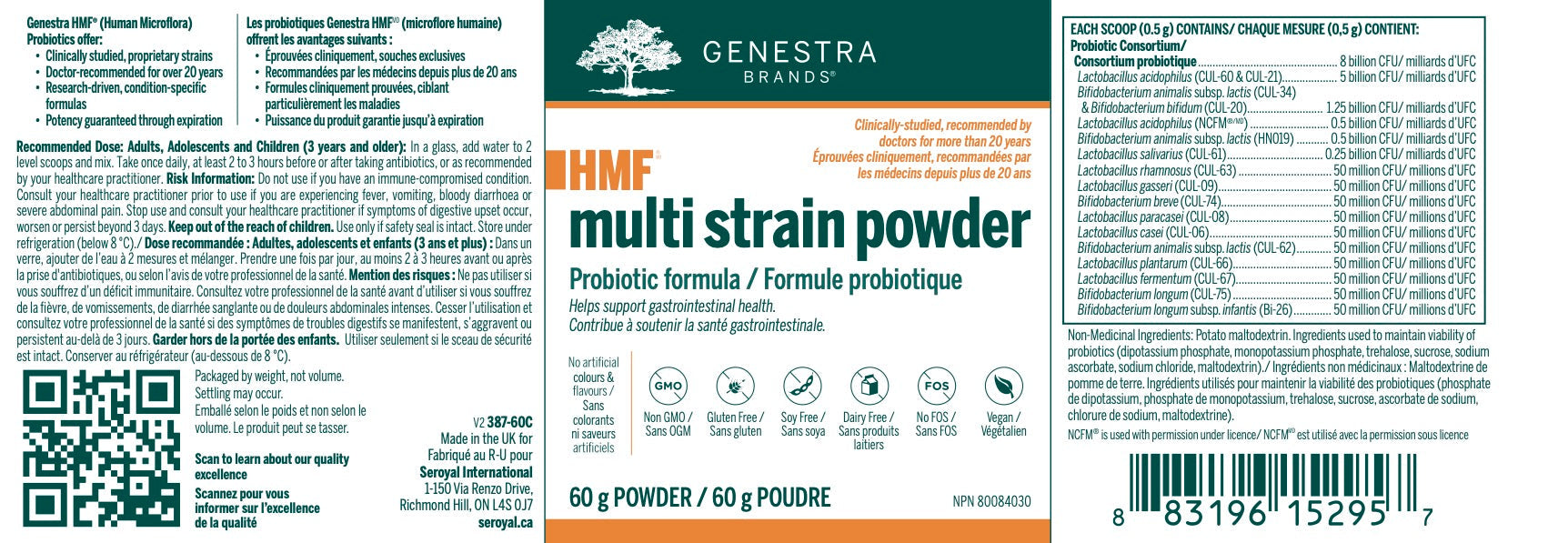 HMF Multi Strain Powder offre une combinaison complète de 17 souches probiotiques brevetées. Chaque portion pratique, à prendre une fois par jour, contient 10 souches de Lactobacilli et sept souches de Bifidobacteria pour favoriser la colonisation de l'intestin grêle et du gros intestin. Dans un essai contrôlé par placebo, la supplémentation quotidienne en HN019, une souche probiotique présente dans le produit HMF® Multi Strain Powder, a favorisé une flore intestinale saine. Elle a augmenté de manière significative le nombre de Bifidobacteria et de Lactobacilli, tout en réduisant la population d'Enterobacteria (un genre qui comprend de nombreuses bactéries pathogènes). Un autre essai a démontré que cette souche favorisait la santé gastro-intestinale, comme en témoignent l'amélioration du temps de transit de l'intestin entier et les indices de confort abdominal. De même, HMF Multi Strain Powder contient les souches CUL-60, CUL-21, CUL-34 et CUL-20, dont les essais cliniques ont démontré qu'elles soutenaient le confort intestinal et favorisaient un équilibre de la microflore dans le tube digestif. HMF® Multi Strain Powder est une excellente option de rechange pour les adultes et les enfants qui n'aiment pas les capsules ou qui ont des difficultés à les avaler.