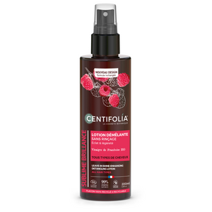 Adaptée à tous les types de cheveux, la Lotion démêlante brillance sans rinçageCentifolia illumine et facilite le démêlage de vos cheveux grâce à sa formule bio efficace et ultra-douce et biodégradable.Le vinaigre de Framboise BIO a été minutieusement sélectionné pour donner de l’éclat et de la souplesse à vos cheveux. La combinaison du vinaigre de framboise et de l’acide lactique permet d’apporter souplesse et brillance, ils resserrent les écailles pour un cheveu plus lisse et ainsi plus facile à démêler.