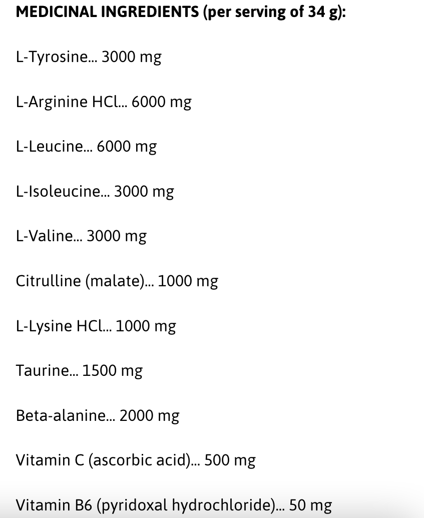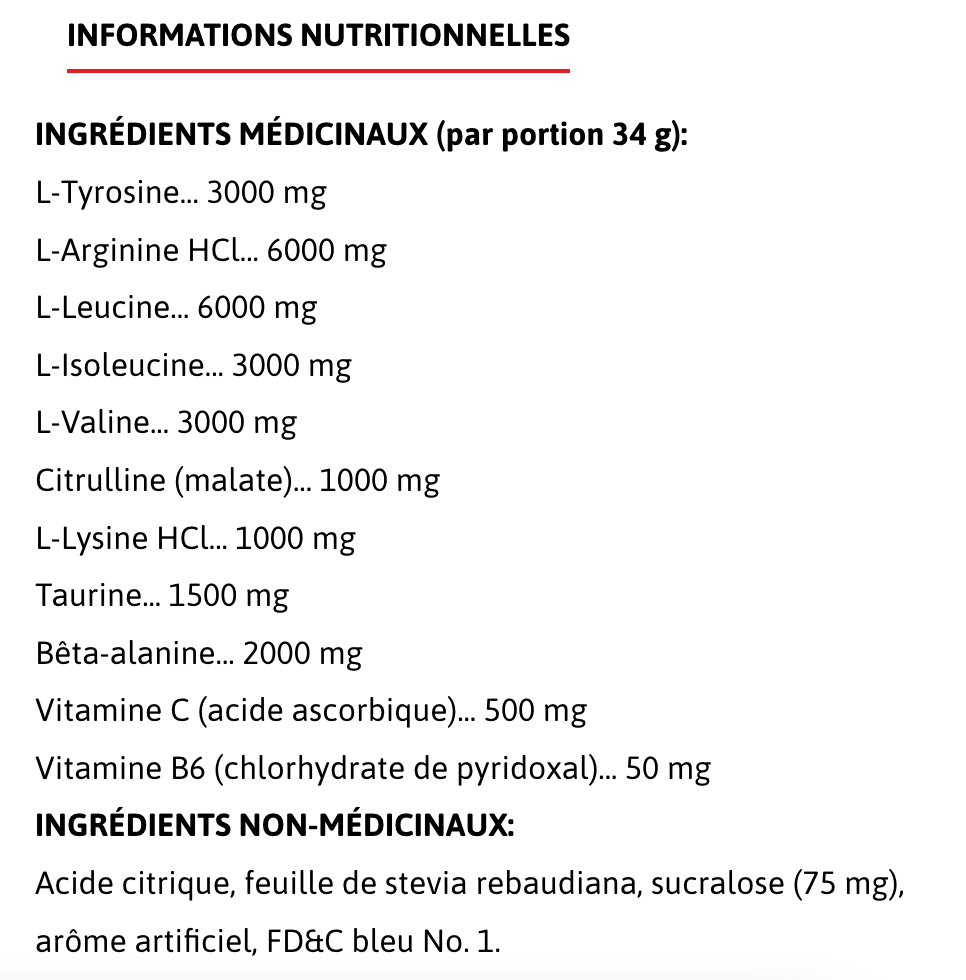 Basée sur un mélange de L-Arginine, L-Leucine, L-Valine, L-Isoleucine, L-Tyrosine, Beta-Alanine, L-Lysine, L-Citrulline di-malate, L-Taurine, Vitamine B6 et d’acide ascorbique (Vitamine C).