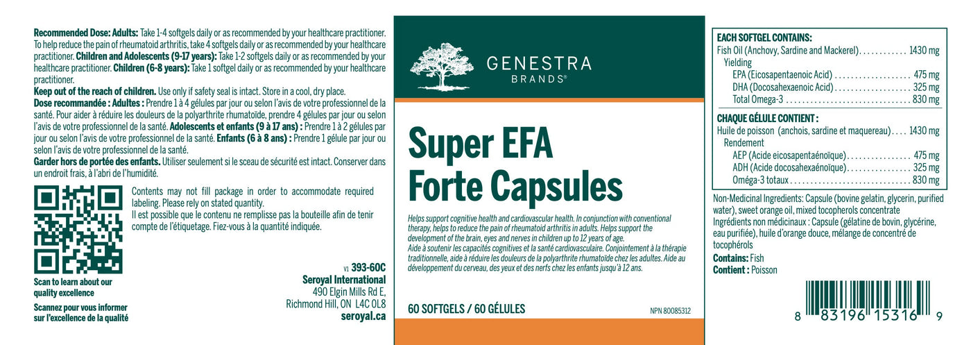 Le Super EFA Forte Capsules offre une formule très concentrée d'huile de poisson qui fournit de l'AEP et de la DHA sous forme de triglycérides biodisponibles. Chaque gélule d'une pureté exceptionnelle offre 800 mg d'AEP et de DHA pour soutenir la santé cognitive et cardiovasculaire ainsi que la santé des articulations chez les adultes aux prises avec l'AR. Le DHA est l'un des acides gras oméga-3 les plus importants du cerveau, où il contribue à réguler la fluidité membranaire, la formation des synapses et la production de cytokines. Les recherches cliniques ont démontré que le DHA peut soutenir la santé cognitive, notamment la mémoire épisodique et l'apprentissage chez les adultes âgés. Le DHA favorise également le développement du cerveau, des yeux et des nerfs chez les enfants de 12 ans et moins. L'AEP et la DHA soutiennent la santé cardiovasculaire en favorisant un sain métabolisme des lipides, une saine fréquence cardiaque et la fonction des plaquettes et de l'endothélium. En association avec les approches thérapeutiques traditionnelles, l'AEP et la DHA contribuent à réduire la douleur chez les adultes qui souffrent d'AR. Il a été cliniquement démontré que ces acides gras omega-3 atténuent l'intensité des douleurs aux articulations, améliorent la force de poigne et facilitent le fonctionnement quotidien chez les adultes qui vivent avec l'AR, ce qui peut découler de leur capacité à réguler l'activité des cellules immunitaires et la production de prostaglandine et de leucotriène Les recherches cliniques ont également démontré que les huiles de poisson à base de triglycérides étaient davantage biodisponibles que les esters éthyliques; une étude fait état d'une plus forte augmentation du taux d'oméga-4 après six mois de supplémentation qu'avec une dose identique d'esters éthyliques.